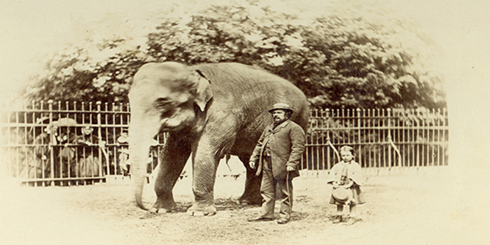 Photo: Jumbo the elephant with Keeper Matthew Scott and small girl, 1870. © Photograph by Frederick York, from ZSL collections.